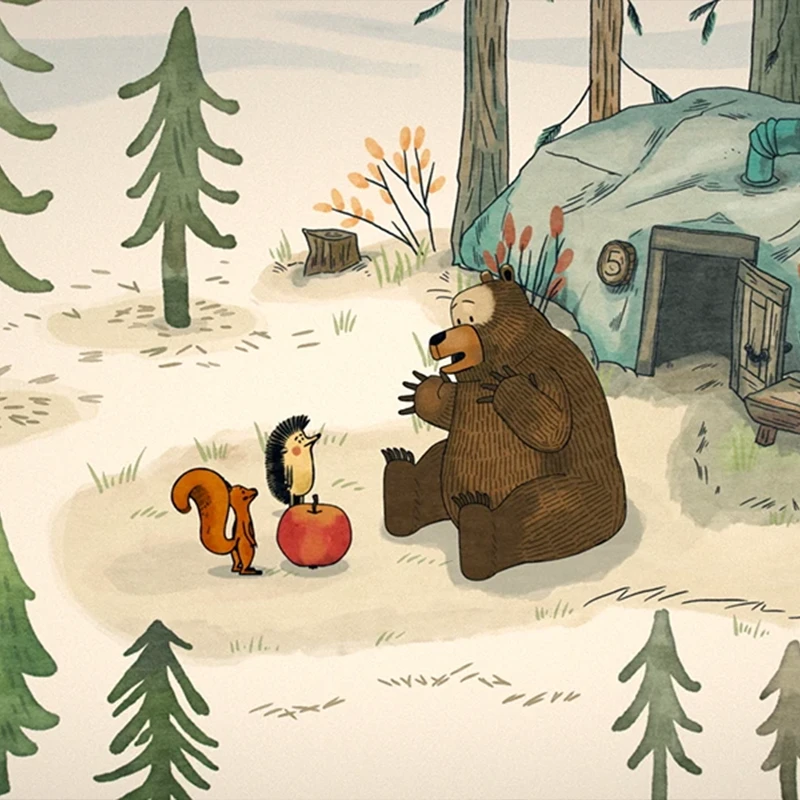 Jež tijekom jutarnje šetnje pronađe prekrasnu crvenu jabuku. Iznosi ju van i kreće u preuređenje svog doma. U međuvremenu, vjeverica naiđe na jabuku. Između dvojice prijatelja izbija svađa oko toga čije je to jabuka. Pitaju ostale stanovnike šume za mišljenje. Frustrirani neodlučnošću zeca i proždrljivošću medvjeda, jež i vjeverica odlaze po savjet pametnoj sovi. Ona brzo shvaća da se radi o jabuci razdora koja je u šumu donijela zlo. Od jabuke na kraju nije ostalo puno, ali jež i vjeverica su sretni što su ipak ostali prijatelji.
