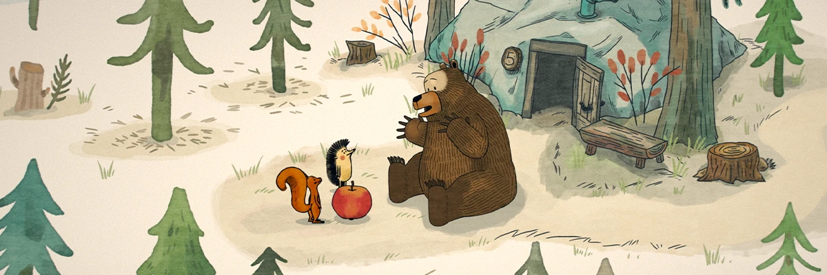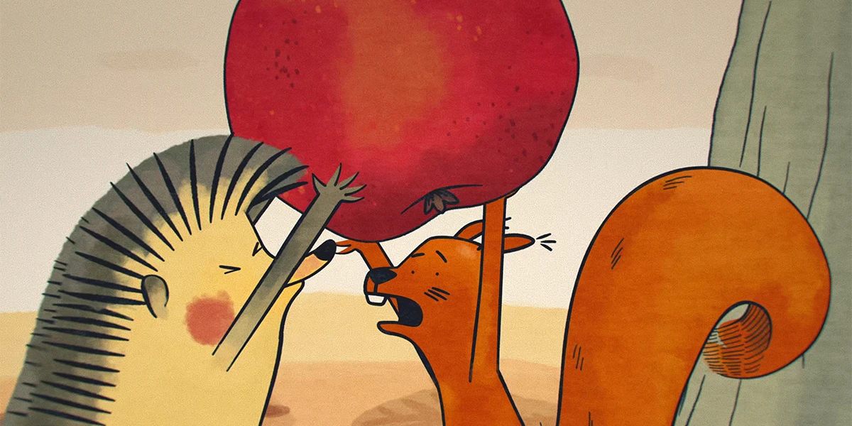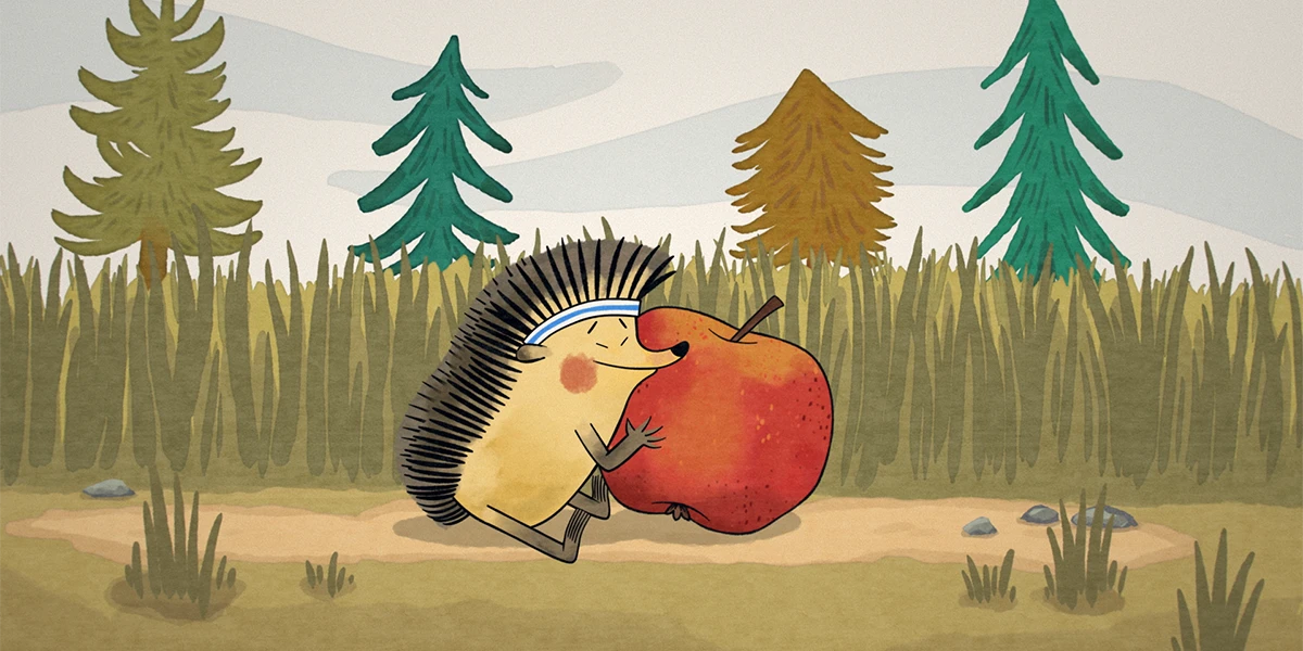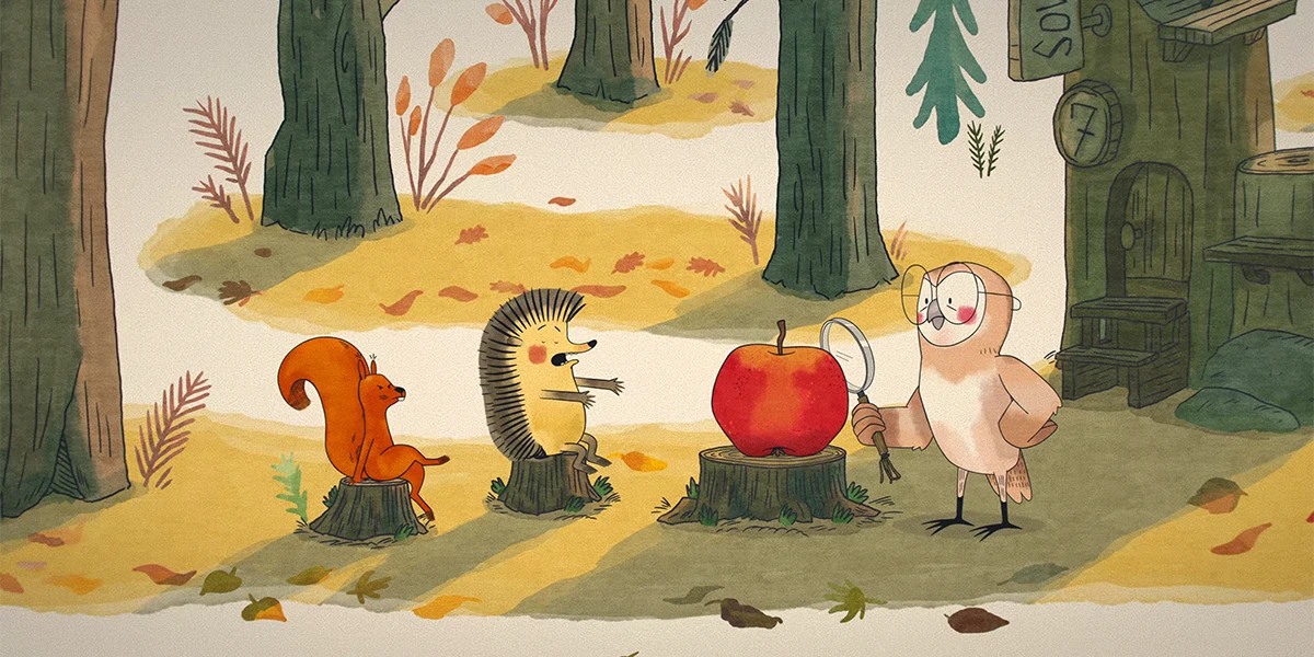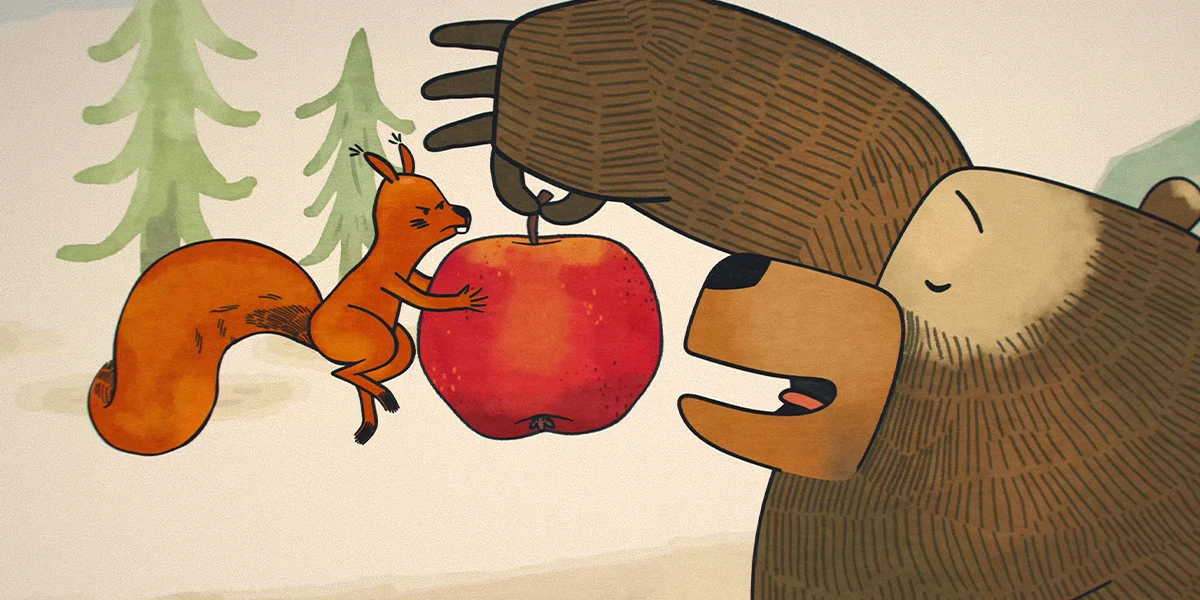 Jež tijekom jutarnje šetnje pronađe prekrasnu crvenu jabuku. Iznosi ju van i kreće u preuređenje svog doma. U međuvremenu, vjeverica naiđe na jabuku. Između dvojice prijatelja izbija svađa oko toga čije je to jabuka. Pitaju ostale stanovnike šume za mišljenje. Frustrirani neodlučnošću zeca i proždrljivošću medvjeda, jež i vjeverica odlaze po savjet pametnoj sovi. Ona brzo shvaća da se radi o jabuci razdora koja je u šumu donijela zlo. Od jabuke na kraju nije ostalo puno, ali jež i vjeverica su sretni što su ipak ostali prijatelji.
